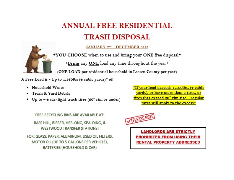 - Bass Hill Landfill ($9.00 ton) and Westwood Landfill (Summers only, $2.00 CY, ONLY on Westwood Landfill days).